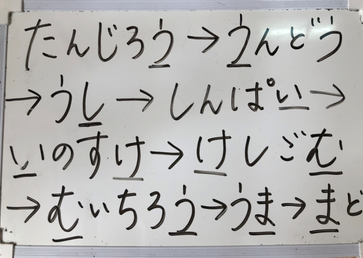これはヨーコ先生が実際のしりとりをホワイトボードに書き起こしたもの。